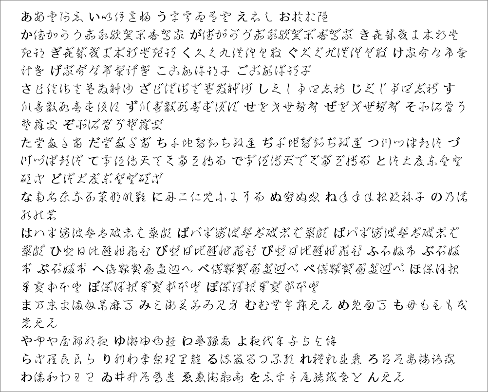 - か行・さ行・た行・は行の仮名については濁点付グリフも追加(141グリフ)。